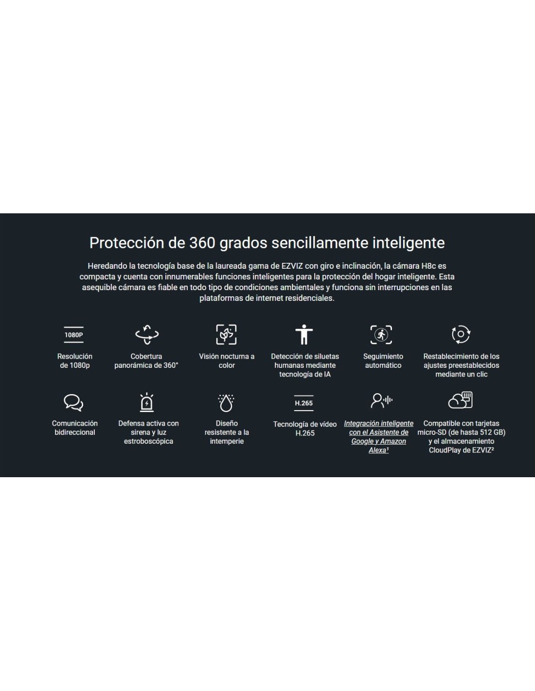 La cámara de seguridad EZVIZ H8c proporciona una vigilancia de alta calidad con resolución Full HD y unProtege tu hogar con la EZVIZ H8c: cámara Wi-Fi exterior con visión 360°, resolución Full HD, visión nocturna a color y resistencia al agua. Seguridad inteligente y completa, fácil de instalar.