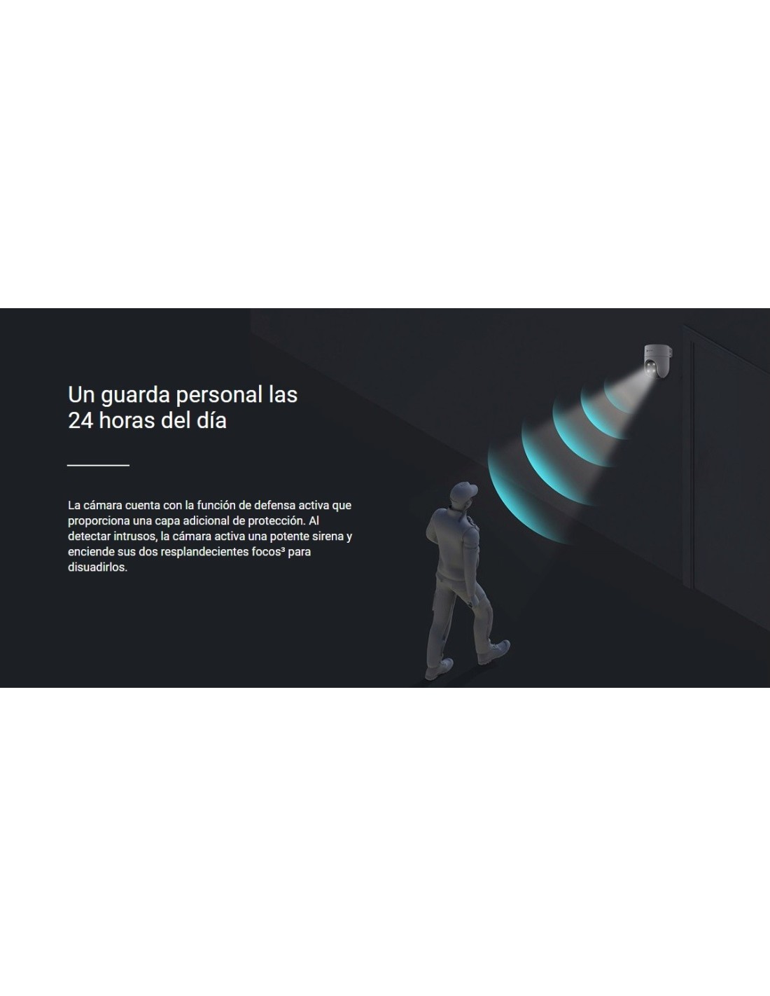 Incluye defensa activa con sirena y luces estroboscópicas que se activan al detectar intrusos, disuadiendo posibles amenazas y aumentando la seguridad del hogar.