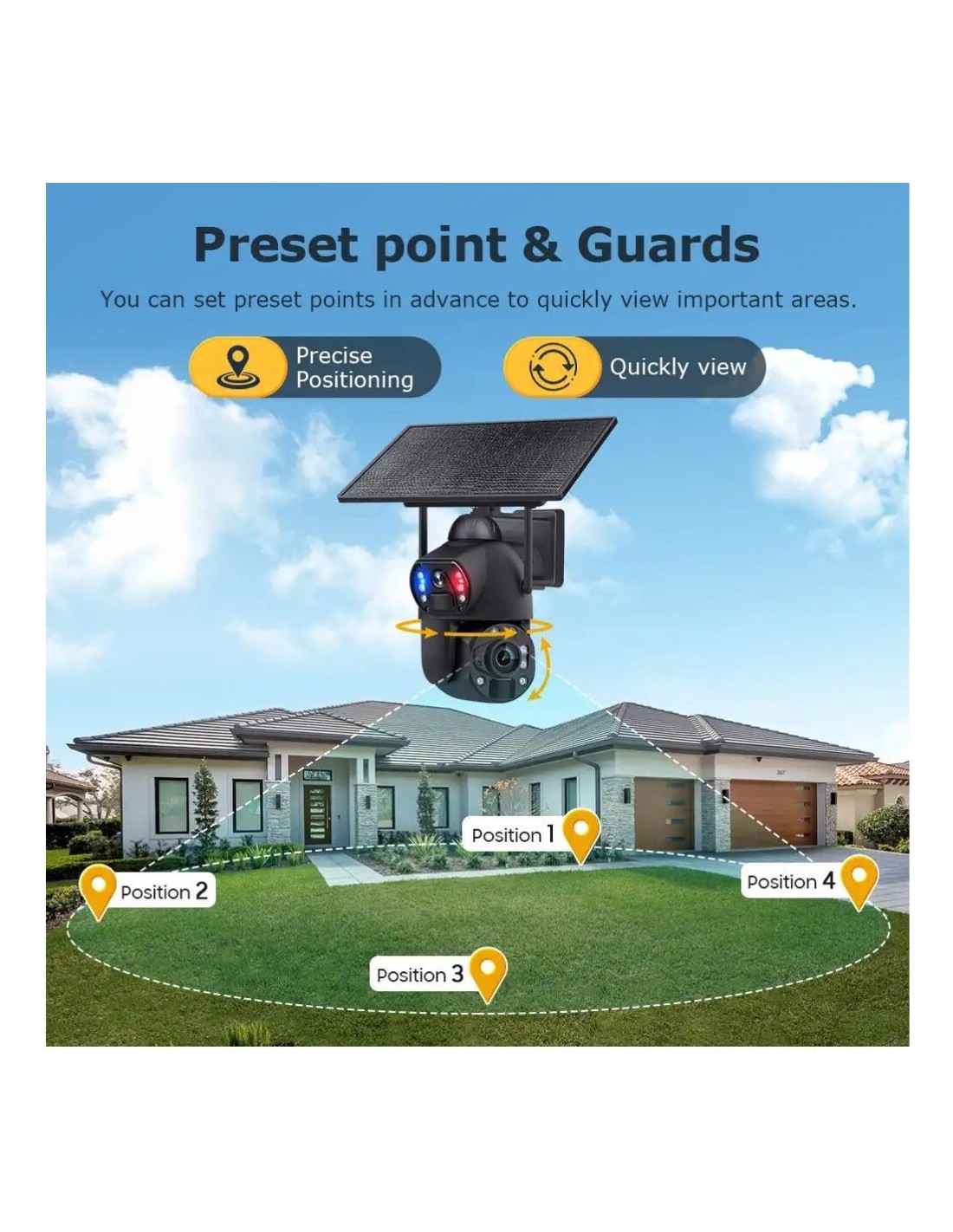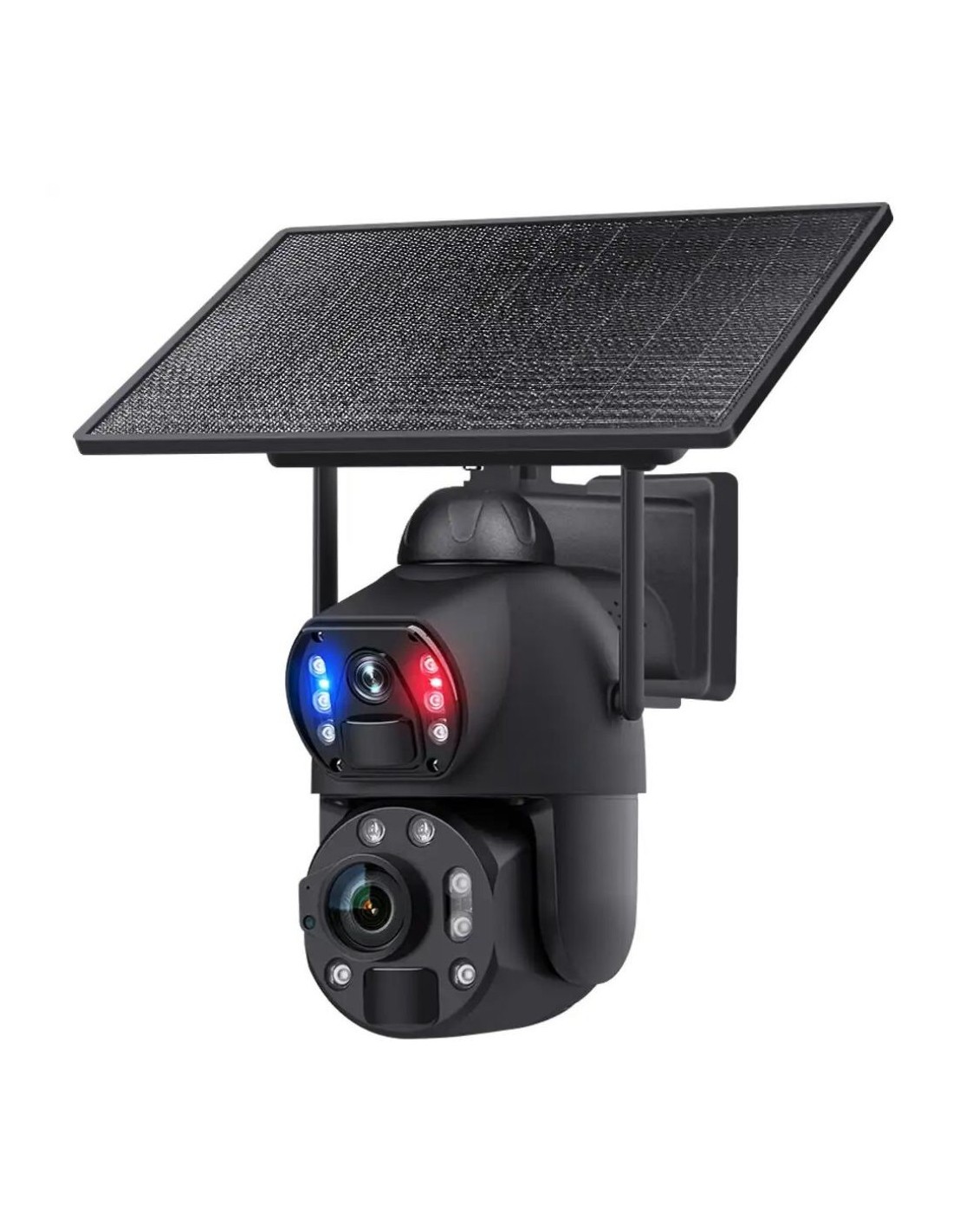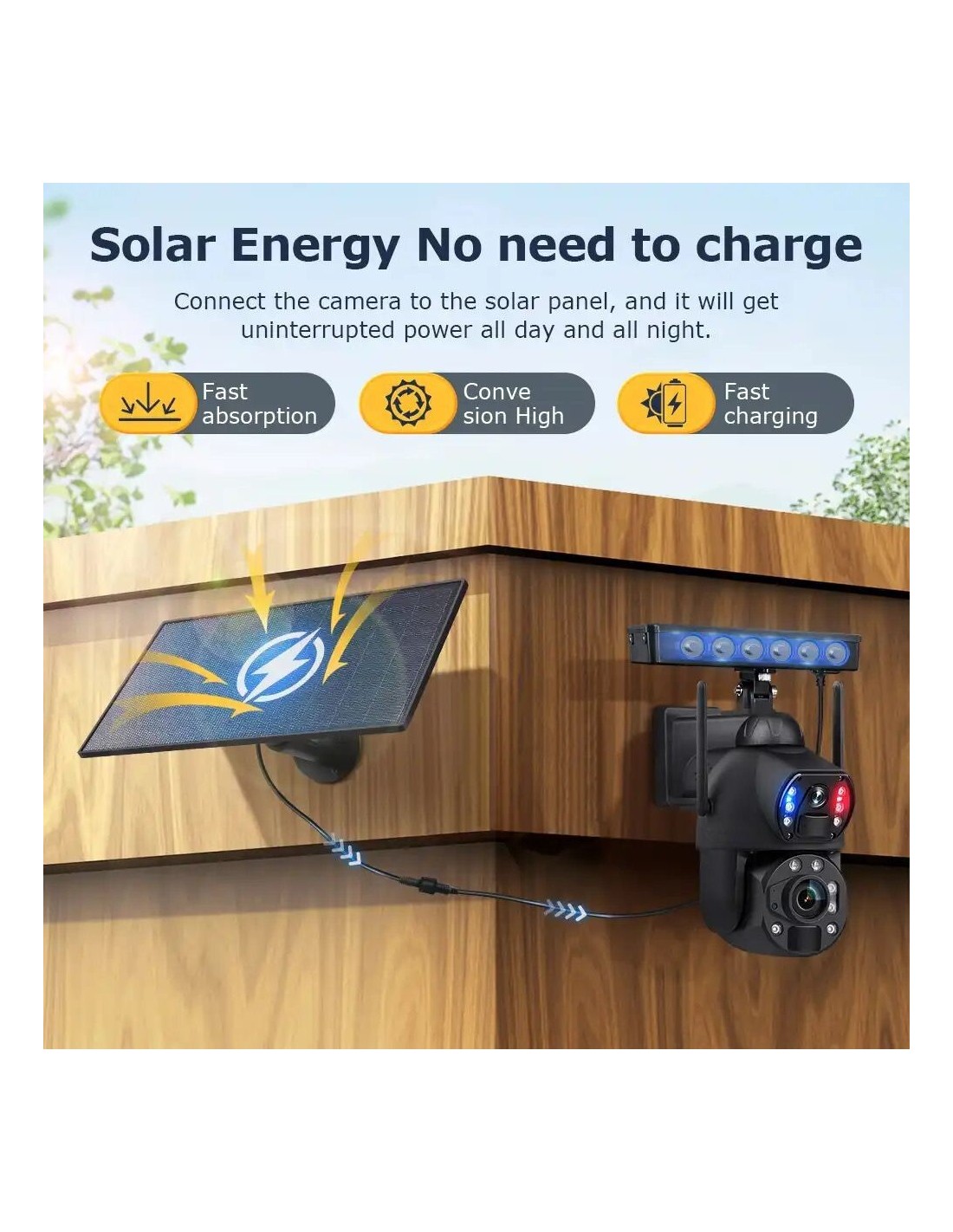Equipada con lámpara láser infrarroja, garantiza una visión clara incluso en completa oscuridad. Su sistema de rotación de 355° horizontal y 110° vertical asegura una cobertura panorámica. Alimentada por un panel solar de 10W y una batería de 20,000mAh, esta cámara es completamente autónoma y capaz de operar de manera continua, incluso en condiciones climáticas adversas.