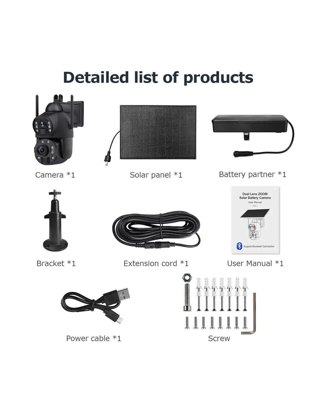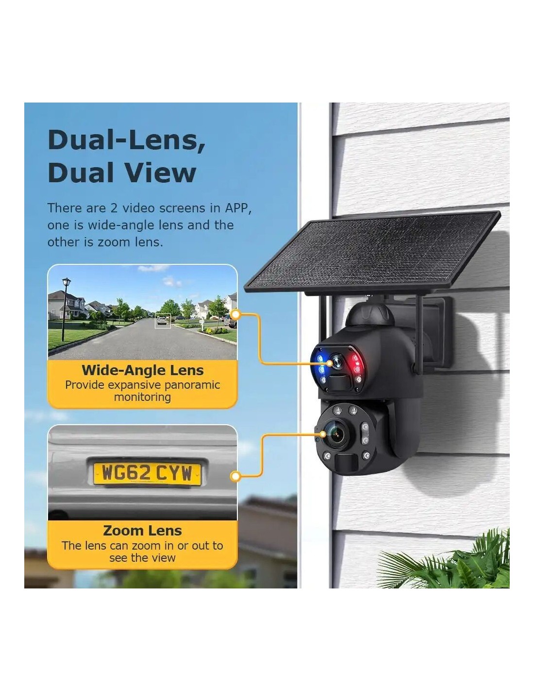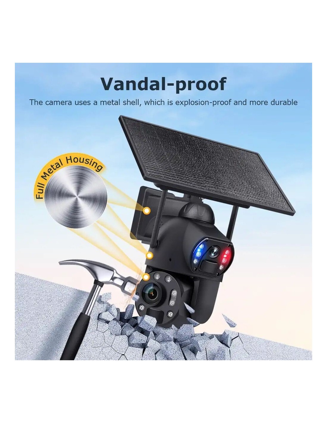Equipada con lámpara láser infrarroja, garantiza una visión clara incluso en completa oscuridad. Su sistema de rotación de 355° horizontal y 110° vertical asegura una cobertura panorámica. Alimentada por un panel solar de 10W y una batería de 20,000mAh, esta cámara es completamente autónoma y capaz de operar de manera continua, incluso en condiciones climáticas adversas.