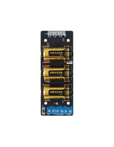 Dispone de 2 entradas de alarma (una de alarma y una de tamper), así como una salida de alimentación auxiliar de 3,3V / 10 mA.