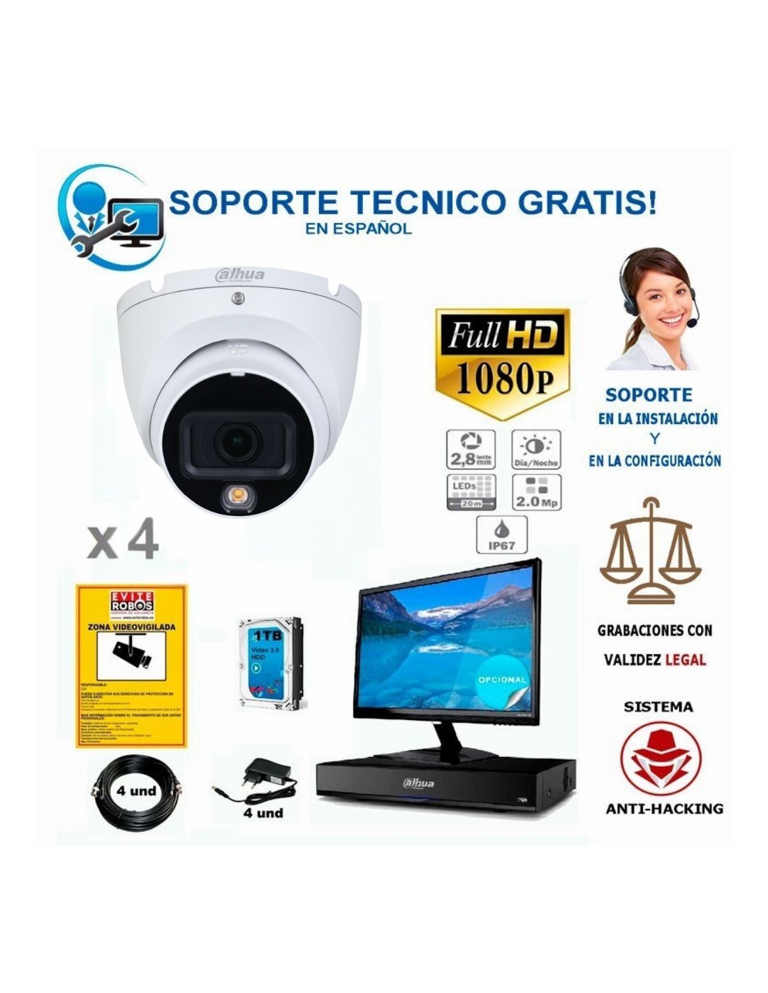 Contiene 4 cámaras Domo HD-CVI de alta resolución (2 Mp), un grabador Dahua de 4 canales, un disco duro Seagate de 1 TB, 4 cables coaxiales de 10 metros, 4 fuentes de alimentación de 12V/1A y una placa CCTV homologada para cumplir con la normativa vigente.