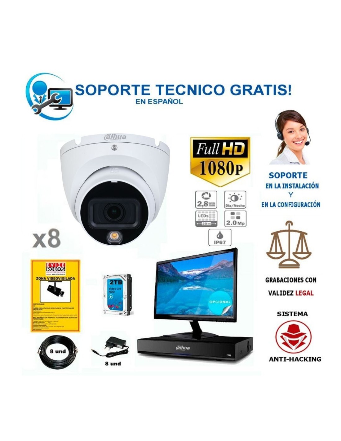 El paquete contiene 8 cámaras Domo Full HD con visión nocturna, un grabador Dahua de 8 canales, un disco duro Seagate de 2 TB, un rollo de cable UTP categoría 6 con conectores, 8 fuentes de alimentación de 12V/1A y una placa de aviso CCTV homologada en español.