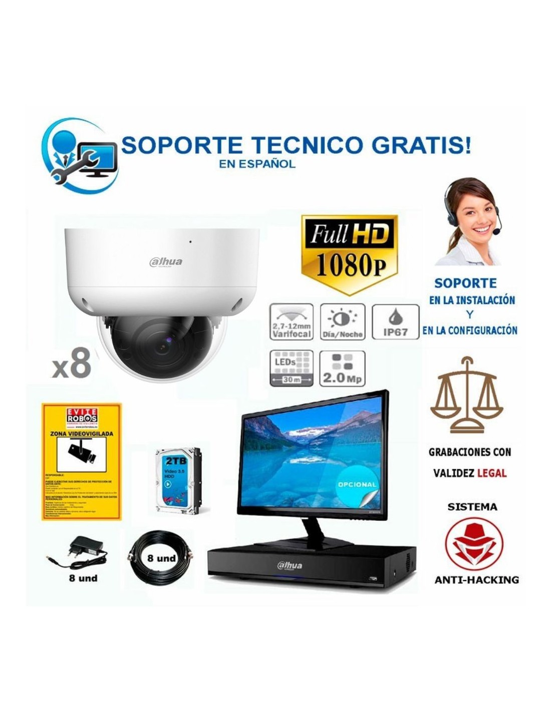 Incluye el grabador Dahua, 8 cámaras domo Full HD, disco duro Seagate® de 2 TB, 8 fuentes de alimentación, conectores y baluns, una placa CCTV homologada y un rollo de cable categoría 6 de 305 metros.